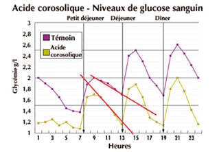 La glycémie horaire chez des patients diabétiques de type II a été mesurée avant et après 30 jours de prise de 48 mg/jour d'acide corosolique versus placebo (voir schéma 1). Par rapport au contrôle, l'administration d'acide corosolique a entraîné une glycémie plus basse et une baisse plus rapide de la glycémie post-prandiale ressemblant à un profil normoglycémique, que chez le sujet non traité. Ces différences montrent que le taux de transport du glucose sous supplémentation en acide corosolique est deux fois plus élevé que le contrôle (0,20 contre 0,11 g/l/h). |